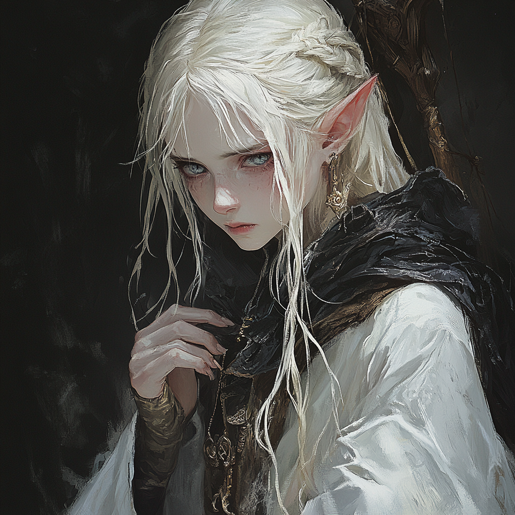 Née d’une liaison oubliée entre un marin elfe de passage et une couturière humaine du port de Deptford, Sennia Blackridge n’a jamais connu le confort d’un foyer. Enfant des embruns et des grincements de bois mouillé, elle a grandi entre les clous rouillés et les insultes, rejetée à la fois par les hommes et les elfes. Très tôt, sa ouïe s’est révélée… anormale : elle perçoit les vibrations des coques, les échos des voix mortes dans la brume, et les soupirs des navires abandonnés.
