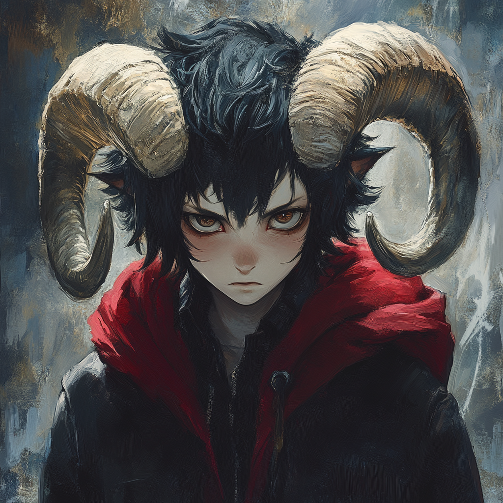 Ses cornes de bélier, beige et recourbées vers l’avant, sont dissimulées sous une capuche rouge. Une fissure fine longe sa corne gauche — vestige d’une chute de toit alors qu’il fuyait des gardes. Sa peau est clair son visage anguleux, marqué par la faim et l’habitude. Ses yeux bleu acier ne cessent jamais d’analyser, de chercher une issue, une menace, ou une opportunité.